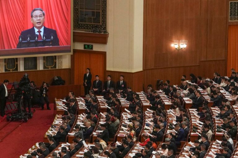 Chinese Premier Li Qiang, on screen, speaks at the opening session of the National People’s Congress at the Great Hall of the People in Beijing Wednesday. AP Photo/Andy Wong China set its economic growth target at “around 5%” for 2025,…