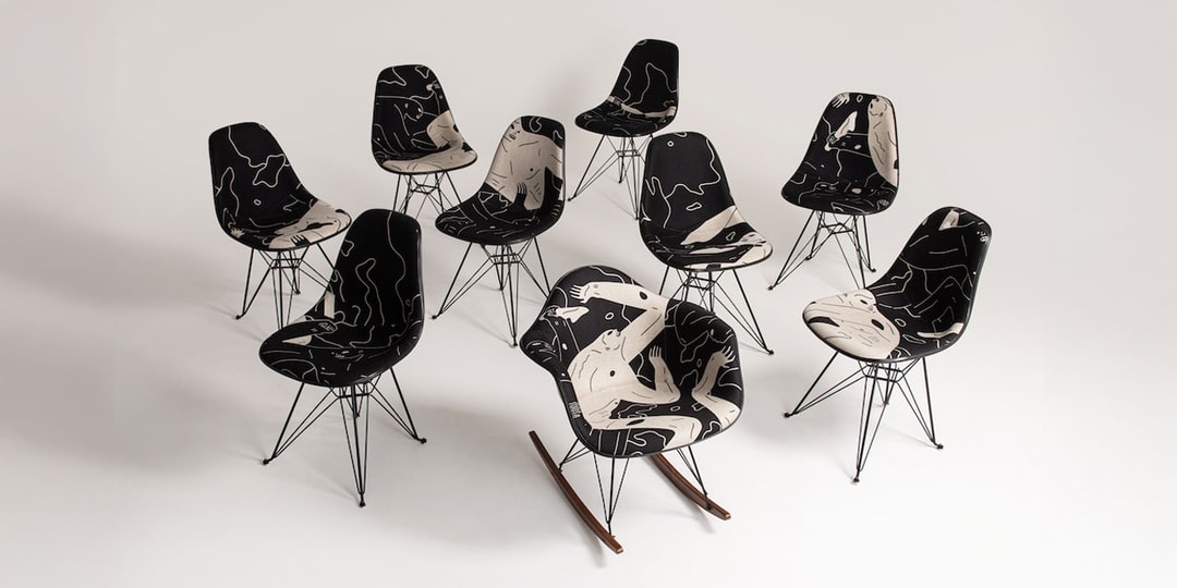 This limited-edition series features nine Upholstered Side Shells on Eiffel Tower Bases and an Upholstered Arm Shell Rocker, each hand-signed by Peterson. Staying true to his signature style, the designs use stark black-and-white contrasts to symbolize the tension between despair and resilience.