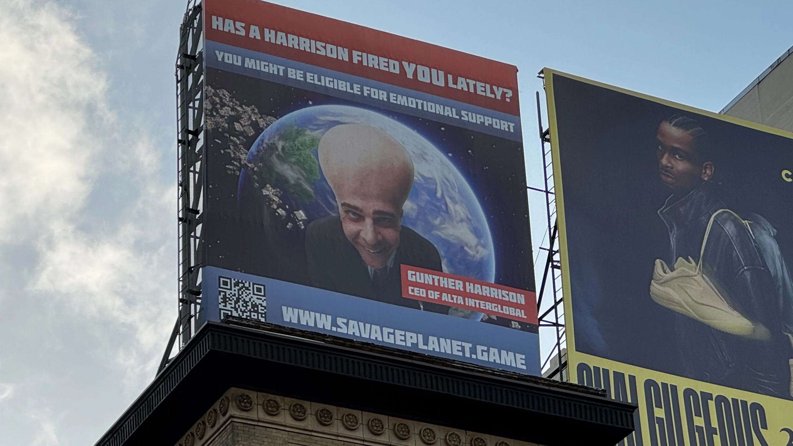 Raccoon Logic’s new San Francisco billboard includes a QR code that directs visitors to a promotional page for Revenge of the Savage Planet, featuring the pithy sympathy message that “We got fired by him as well!” The site promises a donation to the Canadian Mental Health Association for each person who scans the billboard; as of this writing, those donations sit below $2,500.