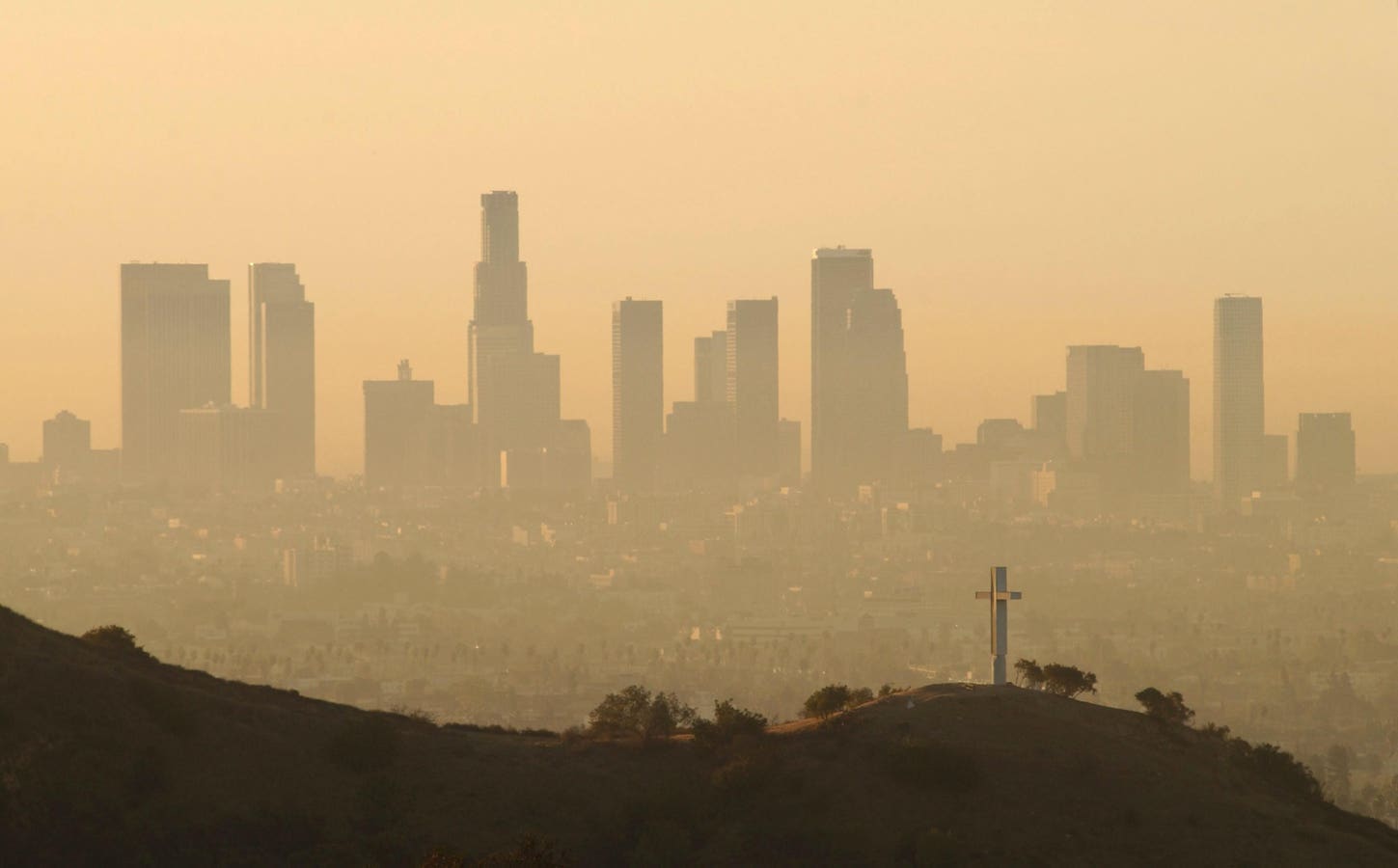 LOS ANGELES – SEPTEMBER 11: Downtown highrise buildings are shown cloaked in dirty air shortly … [+]