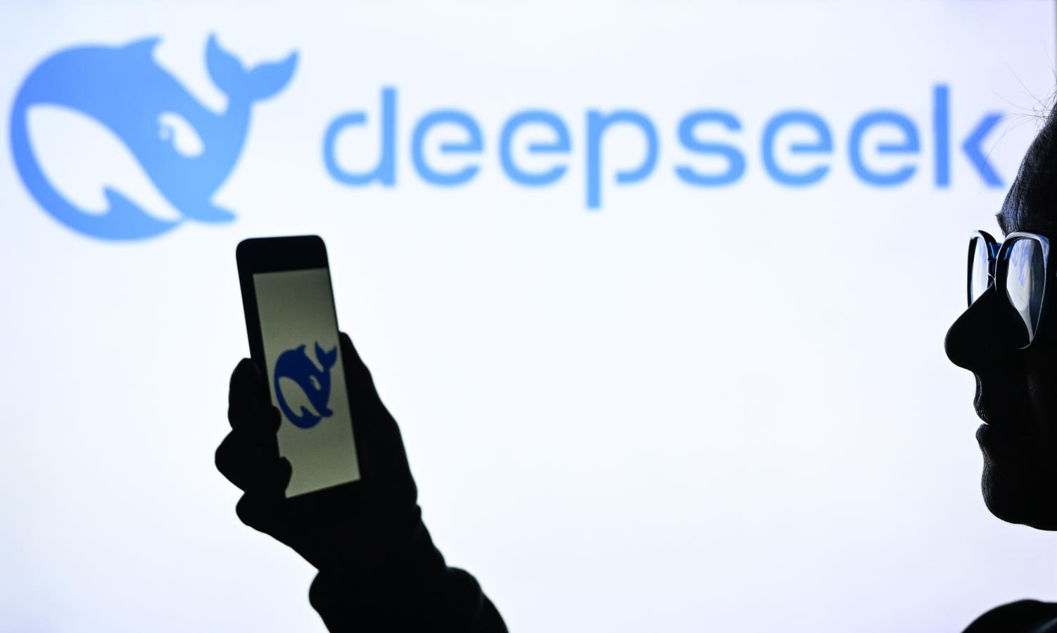 A woman holds a cell phone in front of a computer screen displaying the DeepSeek logo (Photo by … [+]