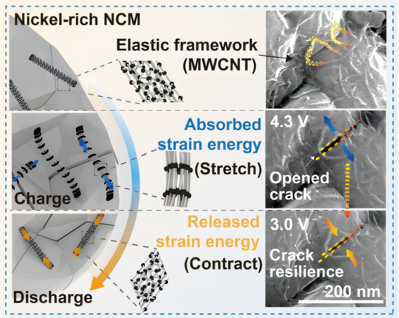 The key to this research, recently published in ACS Nano, is the nano-spring coating technology that can design elastic structures. The research team implemented a multi-walled carbon nanotube (MWCNT) on the surface of battery electrode materials. This absorbed strain energy generated from the charging and discharging process, preventing cracks, and minimizing thickness changes in electrodes to improve stability. The team successfully and effectively suppressed cracks within the battery and simultaneously improved its lifespan and performance.