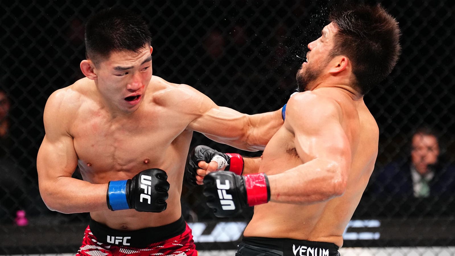 SEATTLE, WASHINGTON – FEBRUARY 22: (L-R) Song Yadong of China punches Henry Cejudo in a bantamweight … [+]
