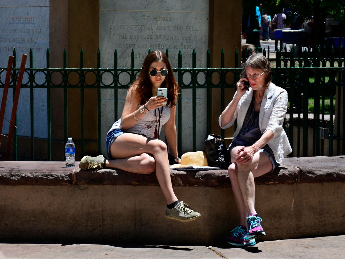 SANTA FE, NM – MAY 24, 2017: Two visitors in Santa Fe, New Mexico, use their smartphones while … [+]